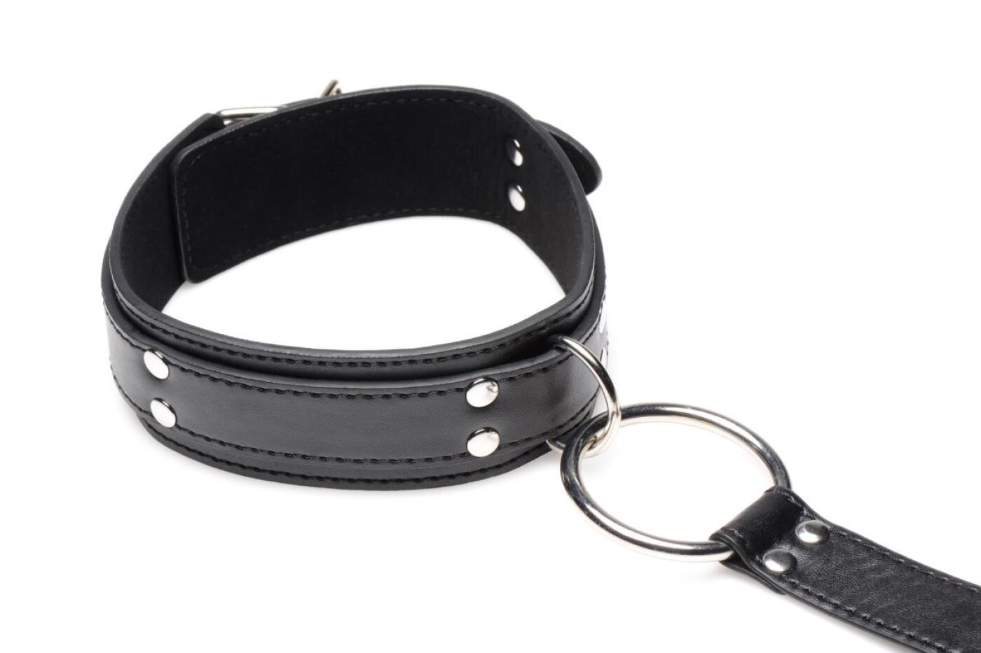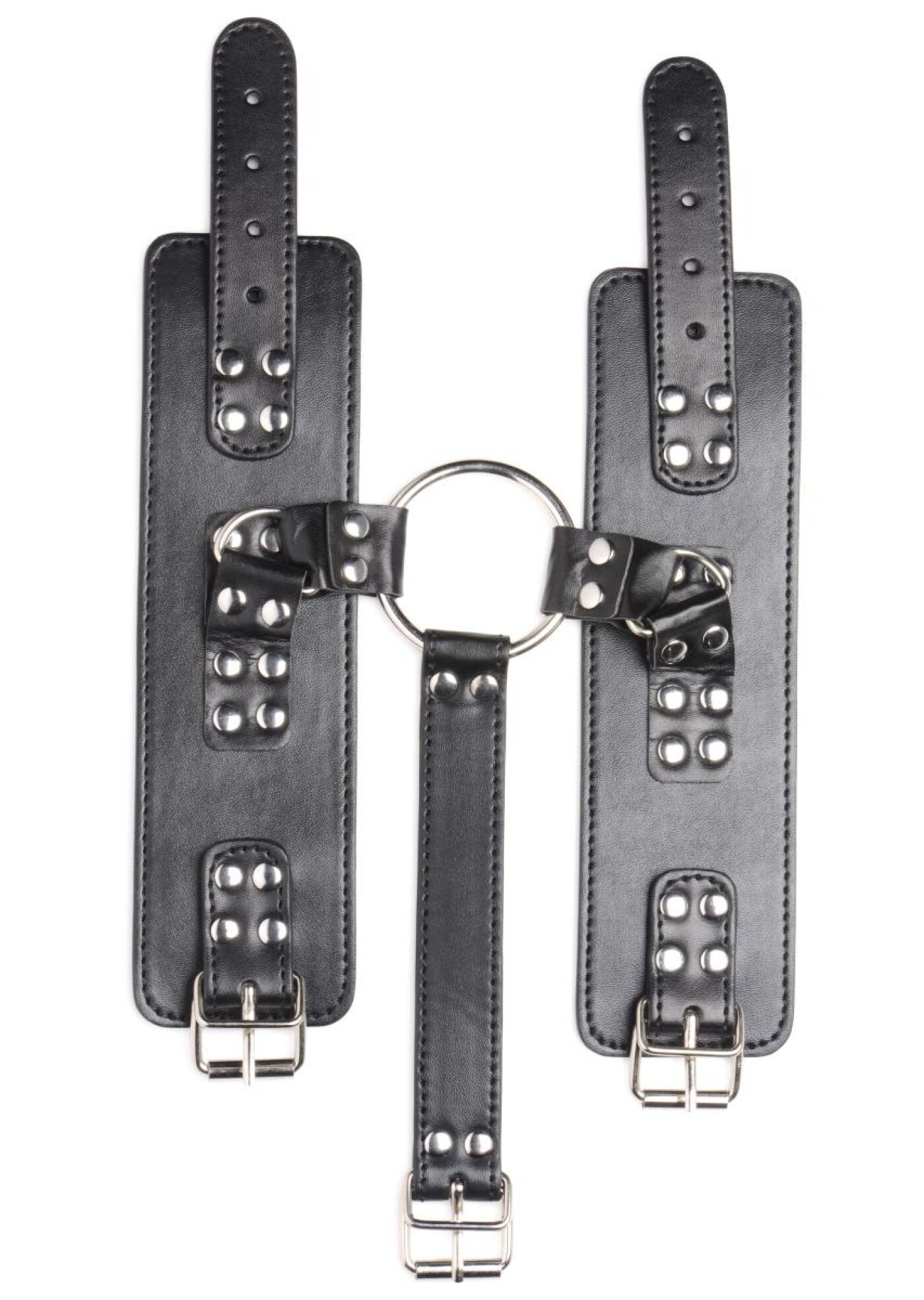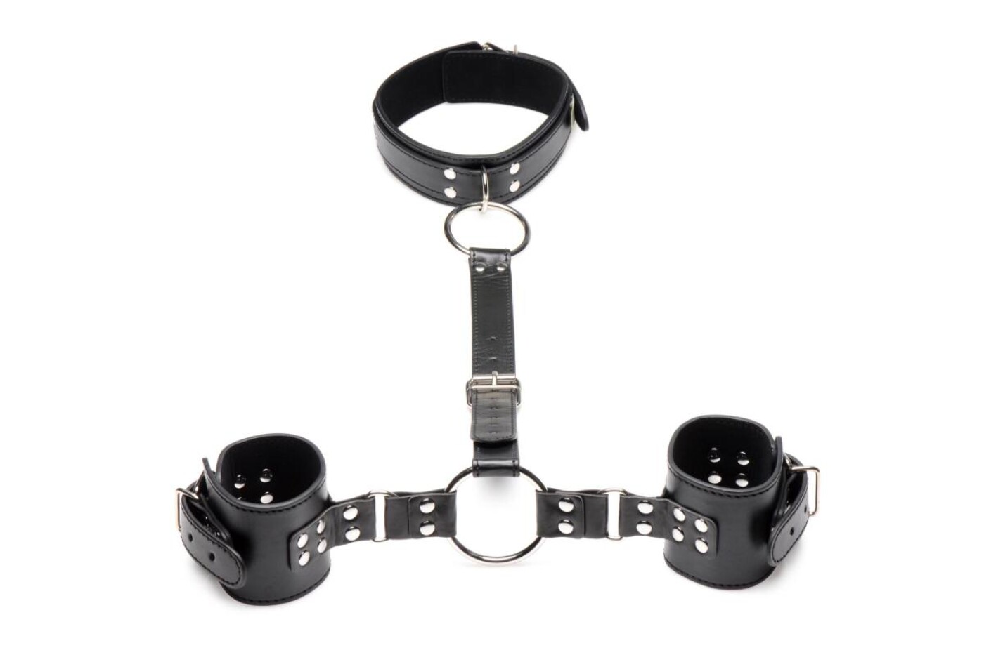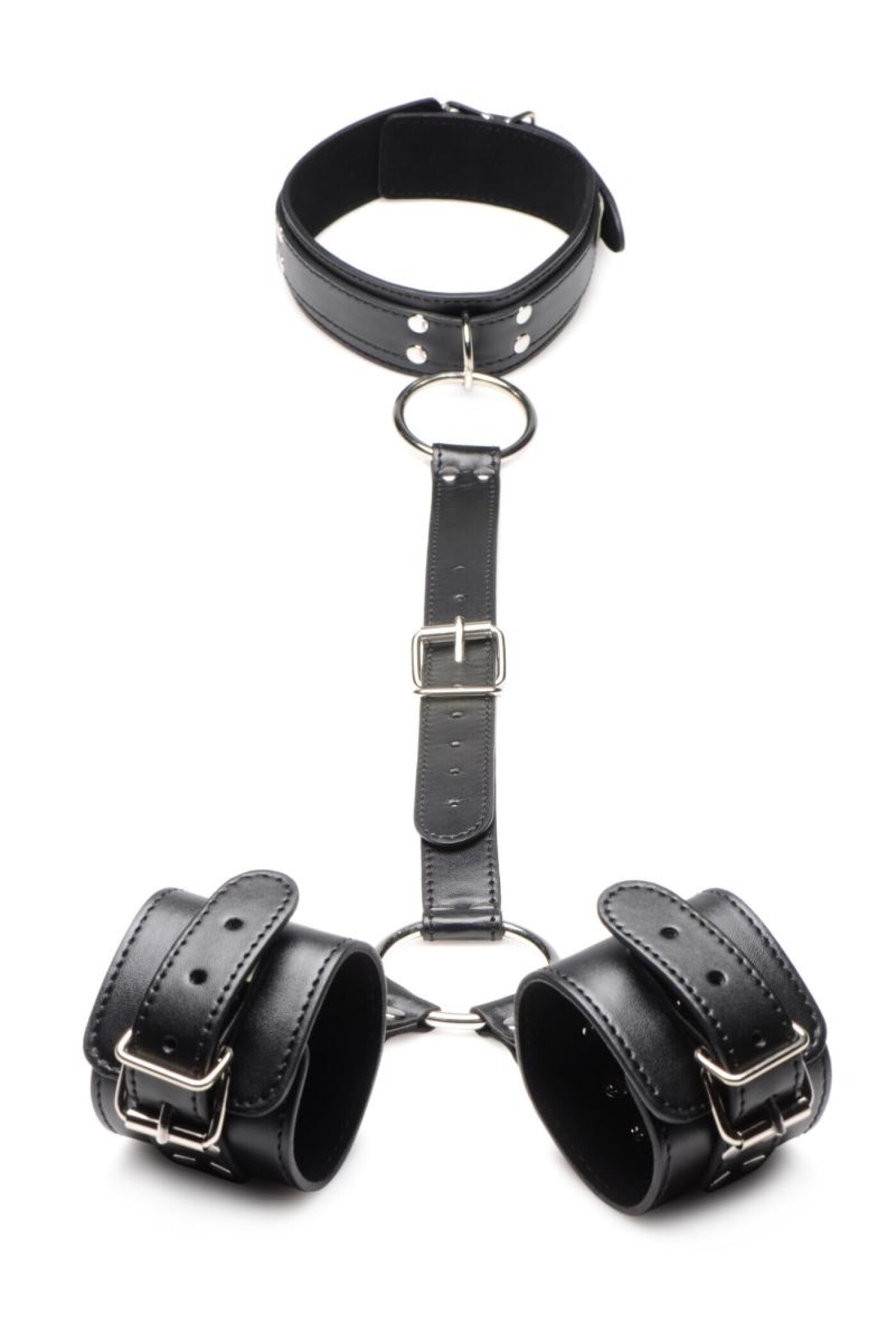 Tie up your sub with these neck-to-wrist cuffs! The soft inner lining is gentle on the skin for optimal comfort in any position The vegan PU-leather is easy to clean and retains the sexy, classic leather look. The large O-rings are made of strong, nickel-free metal and can be fitted with bondage ropes, chains and other BDSM products. The whole set is widely adjustable for the perfect fit on any body.