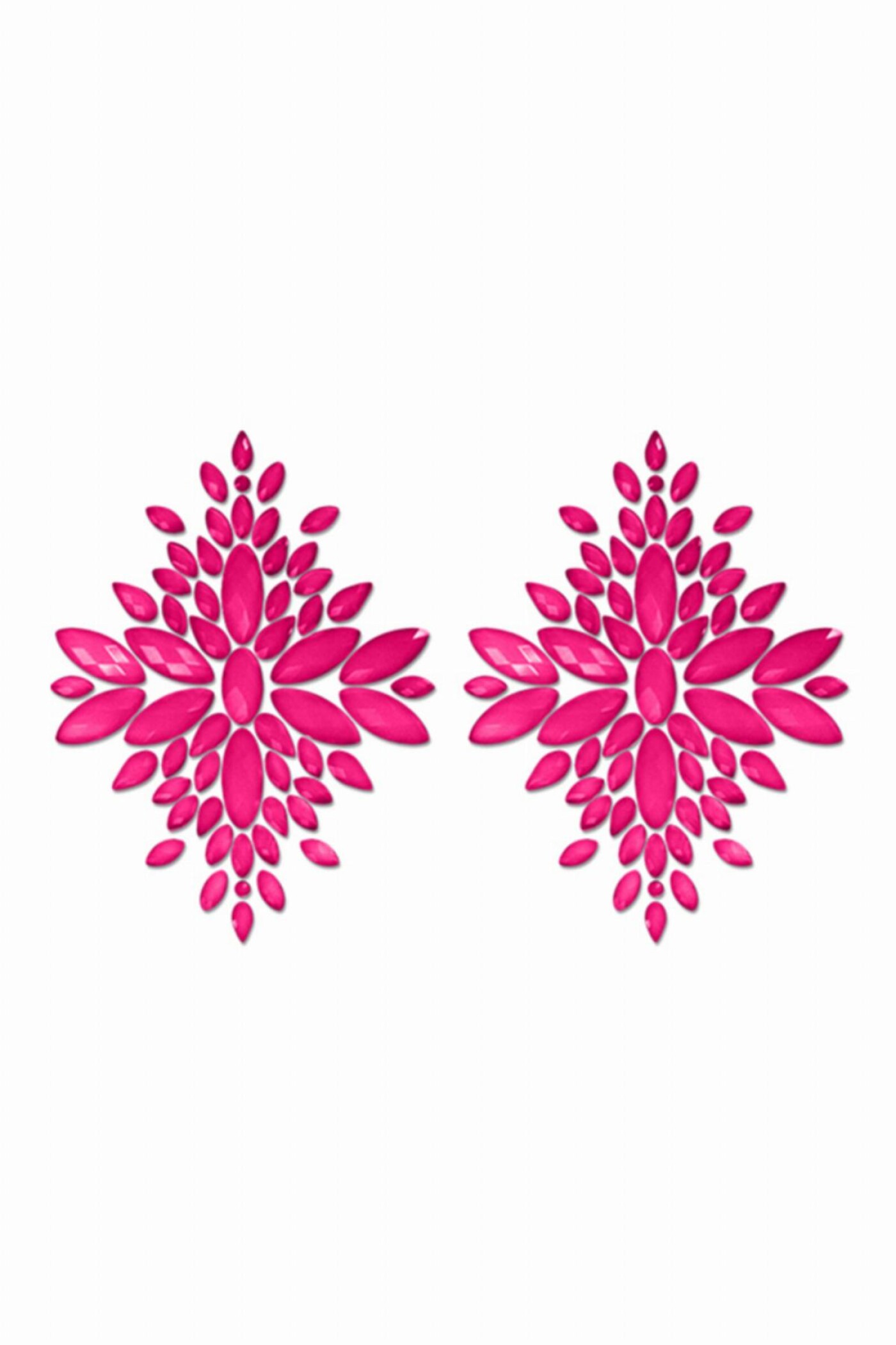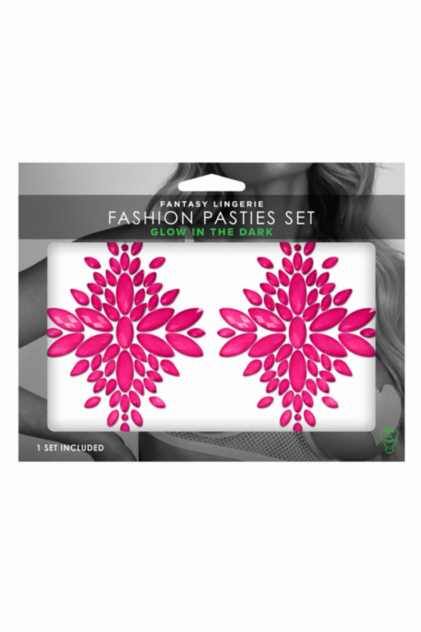 Crystal Pasties that Glow in the Dark - Neon Pink. Start by cleaning the skin using soap and warm water. Ensure that the area is completely dry. Remove the backing from the pasties and apply them to the desired location, taking care to smooth them down carefully. When it's time to remove them, gently and slowly peel the pasties off the skin, avoiding any quick pulling or ripping.