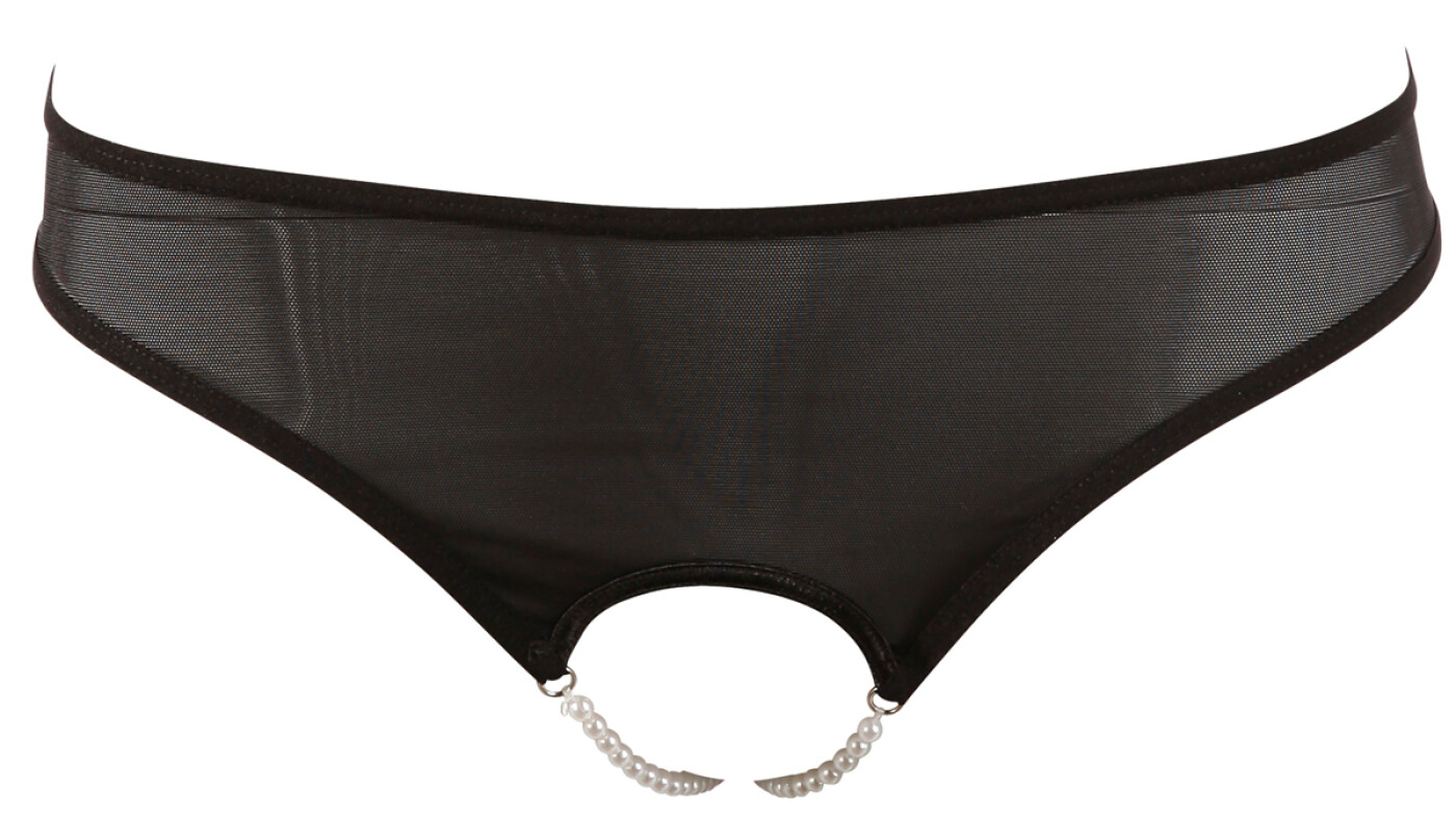 lack sheer mesh brief with two white pearl chains in the open crotch area. 90% polyamide, 10% spandex.